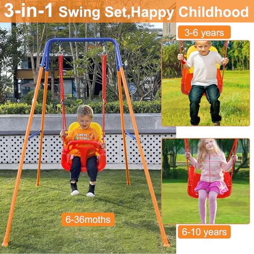 【3-in-1 Toddler Swing Set】Every childhood needs a swing, and our toddler swing can grow with your child. The swing seat features a detachable 3-in-1 design that can be converted into different modes as your child grows, covering an extended age range from 6 months to 10 years old.