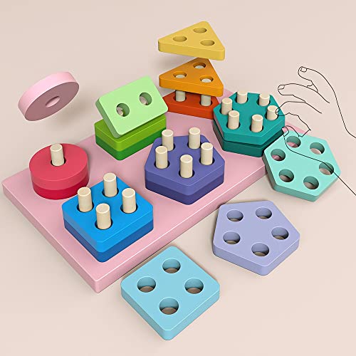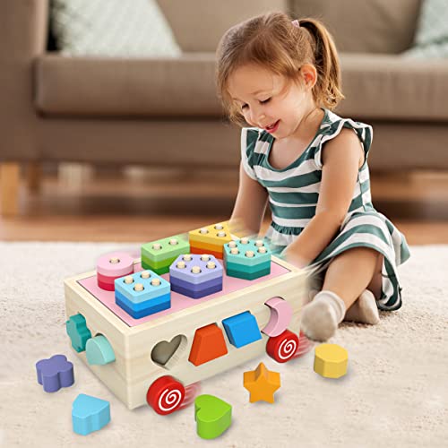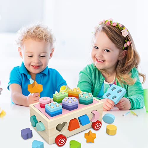 BEERYFUN Wooden Educational Montessori Toys for 1 2 3 Year Old Baby Girls Boys, Wooden Shape Sorter Toddler Toys Birthday Gift for Boys Girls Stacking Games