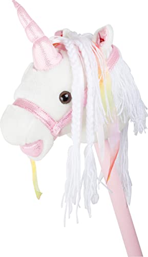 This white unicorn promises a wild ride. The stem is covered with soft fabric and colourful ribbons flutter in the mane. When you press on the right ear, the unicorn neighs three times. Now the trip can begin. Batteries included.