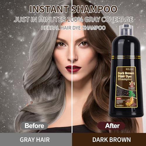 GFEUGS Dark Brown Hair Dye, Hair Dye Shampoo 3 IN 1,100% Grey Coverage-Instant Hair Colour Shampoo for Women Men-Herbal Ingredients, Hair Dye Coloring in Minutes(500ML, 17.6 Fl Oz)(Dark Brown)