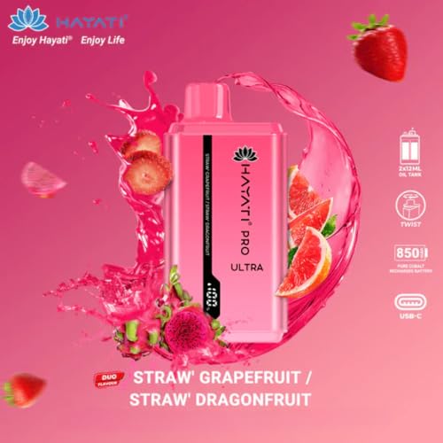 Hayati Pro Ultra 15000 Puffs Disposable Vape, Prefilled Dual E-liquid Tank E-Cig, Visual Display Screen, Draw-Activated Rechargeable Vape Pen, 0mg Nicotine Free (Straw Grapefruit/Straw Dragonfruit)